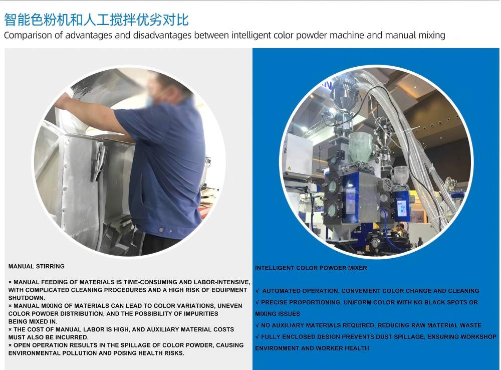 100 kg/h„Intelligentes Farbpulvermischen“ kann nahtlos in zentrale Zuführsysteme, zentrale Fördersysteme und automatische Materialhandhabungssysteme integriert werden. Der Kunststoff-Farbmischer ist mit hochpräzisen Wägesensoren ausgestattet, die die Gleichmäßigkeit des Mischvorgangs und die Konsistenz der Farbe gewährleisten und die automatische Dosierung von Mehrkomponentenpulvern und Additiven unterstützen.